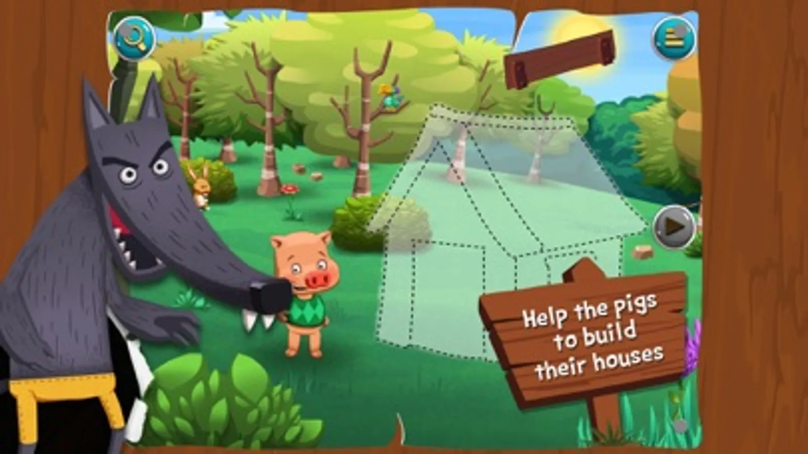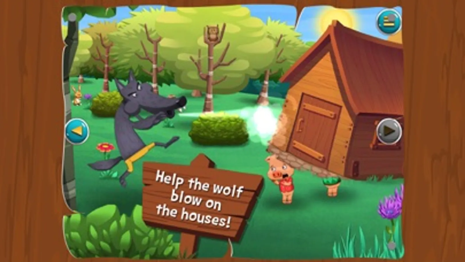 You think you know the story of the three little pigs? Well, we're pretty sure you've never experienced such a cool version! OK, you'll find the big bad wolf and the 3 pigs brothers, but you'll have fun during the story, searching for hidden objects in the backgrounds, helping the pigs to build their houses or the wolf to blow them away!