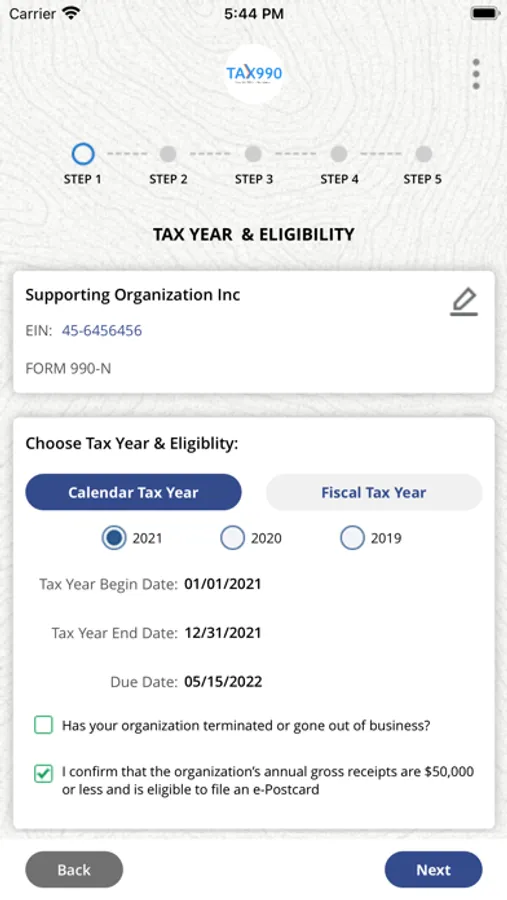 You must include the official organization name recognized by the IRS along with the name of the person filing on behalf of the organization. The EIN is the Employer Identification Number, also known as your Tax Identification Number, or Tax ID. For your tax year period, select whether the organization uses a Calendar Tax Year or Fiscal Tax Year and input the dates. With a simple click, you can confirm your organization makes less than $50,000 - no exact amounts required.