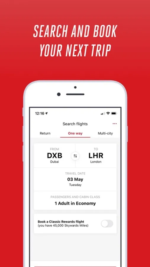 Explore ways to earn and spend your Skywards Miles directly within the app. Enjoy easy access to information about your tier status, benefits and Skywards Miles balance, and manage your account wherever you are.