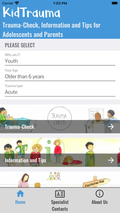The KidTrauma application was developed by Professor Markus Landolt from the University Children´s Hospital Zurich, Switzerland. Professor Landolt is trained as a family and behavioral therapist and specialized in clinical work and research with traumatized children and their parents.