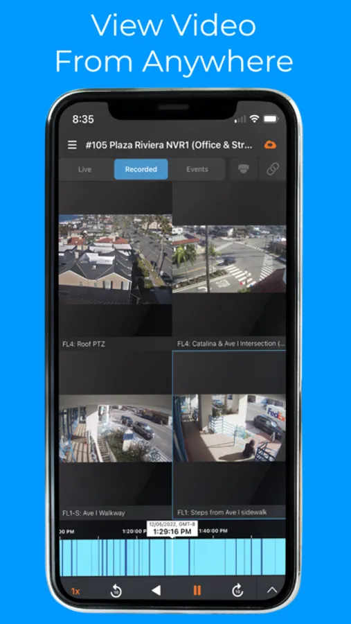 • 360° view in live and recorded video with interactive PTZ control and zoom