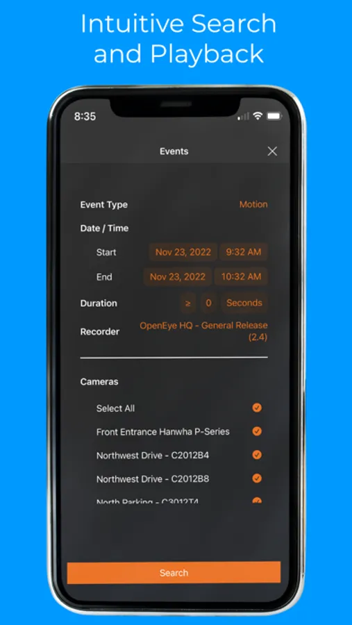 • Specialized search for motion, sensor, intrusion, access, analytics, and queue events