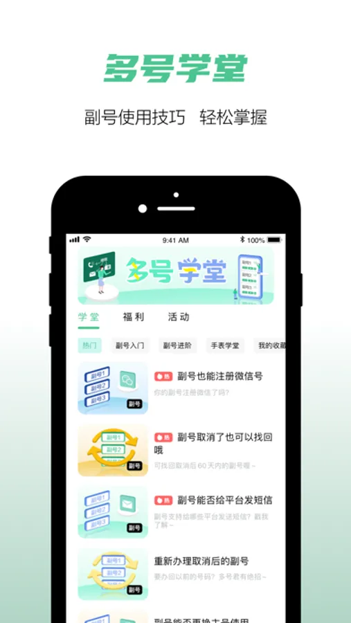 和多号App5.0版本,全新视觉新体验,全新交互方式;支持后四位自定义选号、一键开关机、便捷拨号和发短信(无需添加12583前缀)的功能。全新打造发现栏目,副号学堂、手表学堂等使用技巧,精彩活动和福利等你来体验!