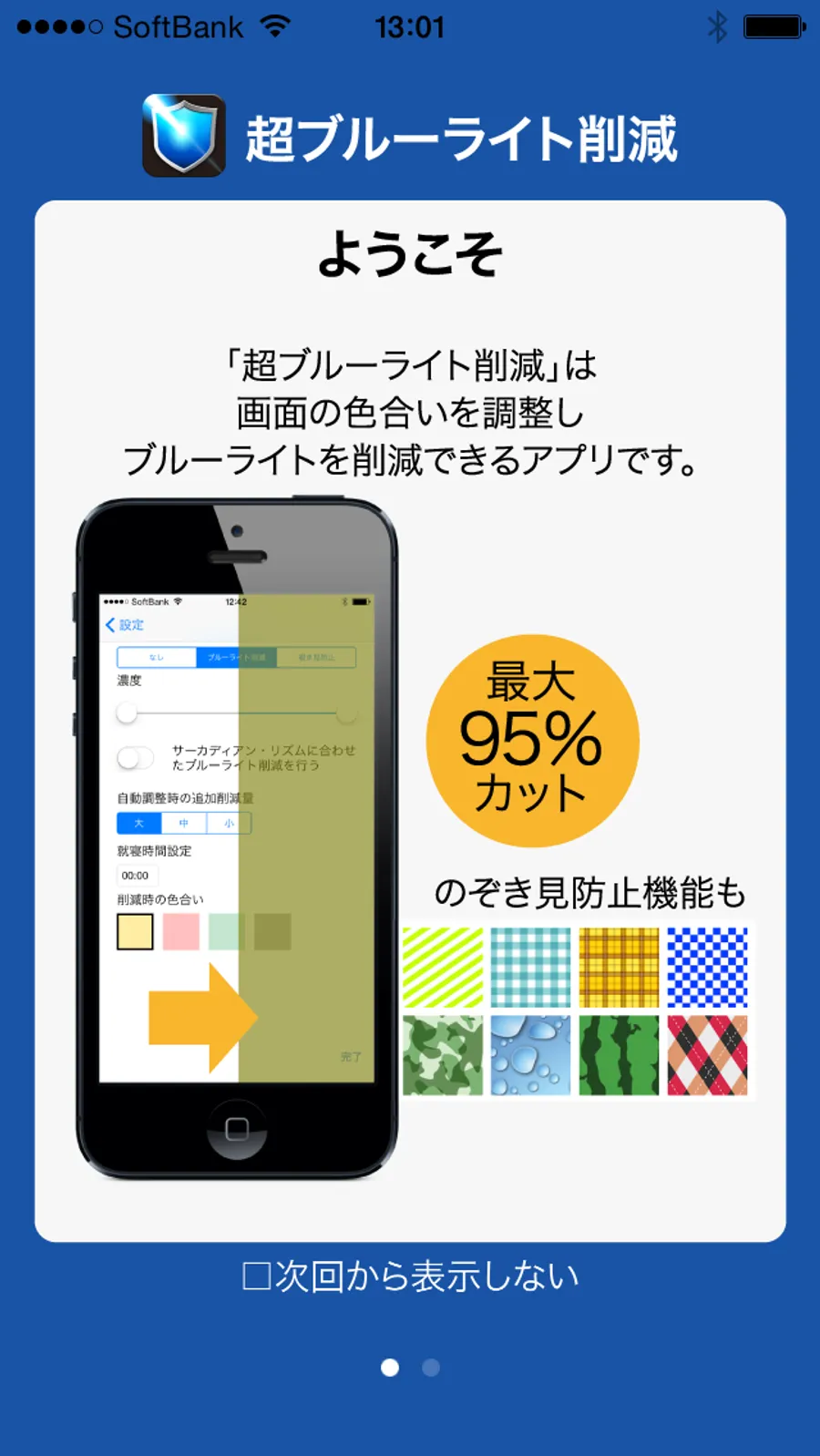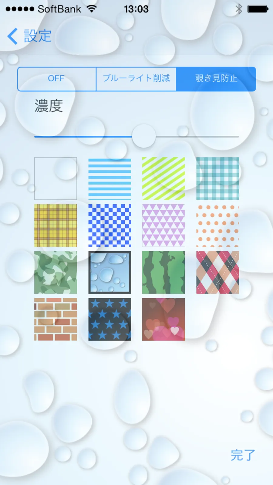 iPhone6 Plusで本製品のフィルタ濃度を最大に設定して、白背景画面を各3回計測した平均値(2014年11月ソースネクスト調べ)