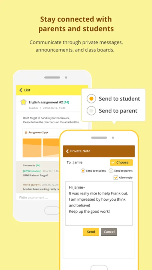 - Share photos and videos, stories, and learning materials through the built-in board feature.