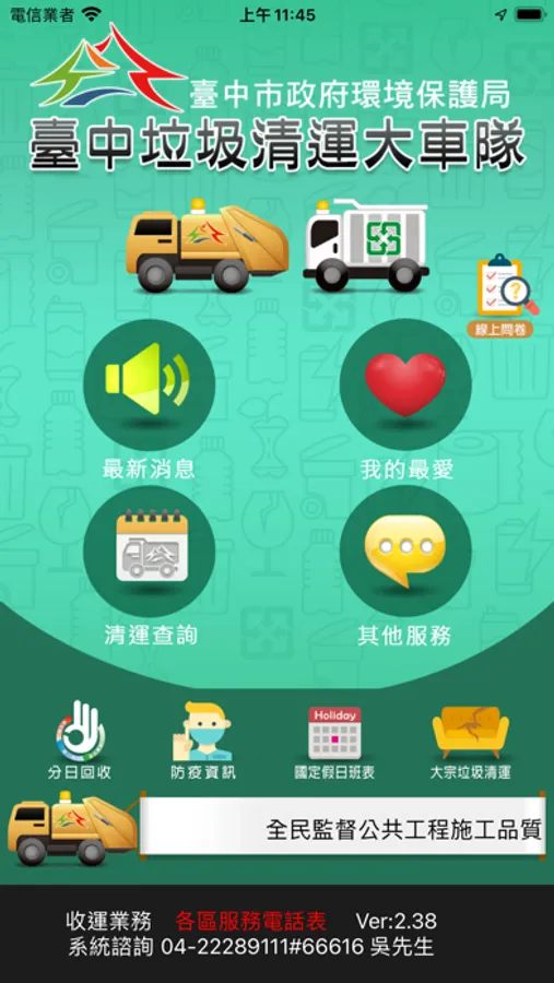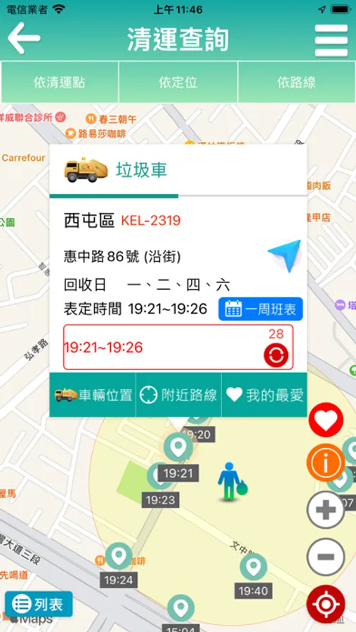 臺中市清潔車已安裝GPS衛星定位設備,民眾可透過行動裝置查詢清運點資訊及垃圾車即時位置。使用行動裝置內建定位功能,可搜尋臨近100、200或300公尺內方便倒垃圾的清運點,並將之設定為「我的最愛」。當垃圾車即將抵達,手機收到推播,再前往清運點,輕輕鬆鬆倒垃圾~