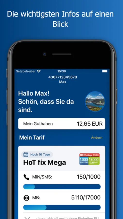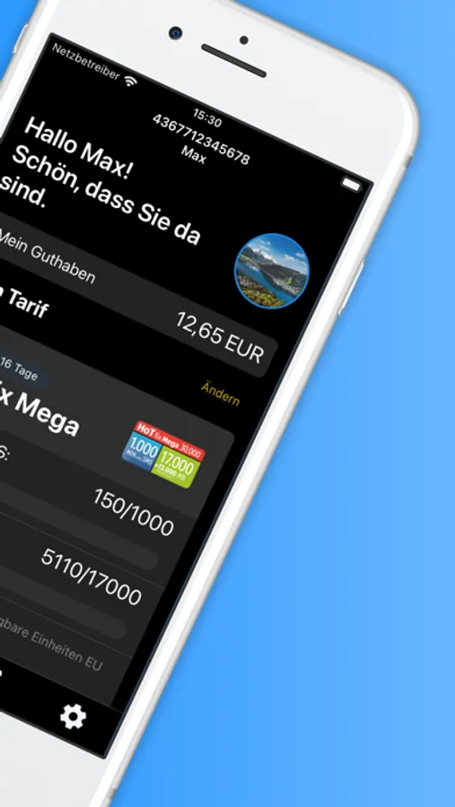 Auf dem "Home" Reiter finden Sie alle relevanten Informationen auf einen Blick. Überprüfen Sie Ihr Guthaben oder den Verbrauch Ihrer im Tarifpaket enthaltenen Einheiten.
