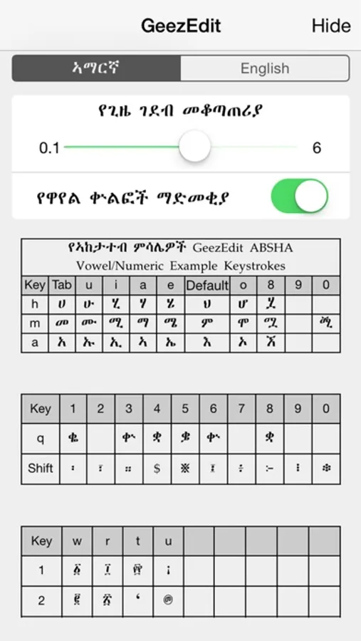 • The App has novel Ethiopic characters such as Ethiopic dollar sign, Santim sign, Copyright, Trade mark, Registration mark, Ethiopic zero and more.