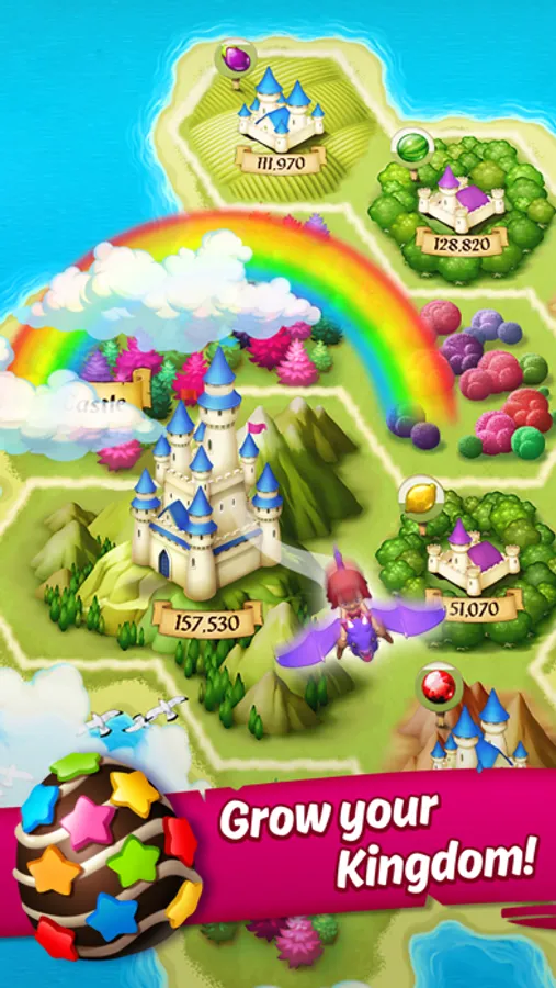 Help the prince & princess to conquer every kingdom. Fly through lots of islands and discover adventures and quests. Beat the puzzles to own the candies you’ll find in farms, forests or mountains, and use power ups to blast and splash gummy & jelly toffee!