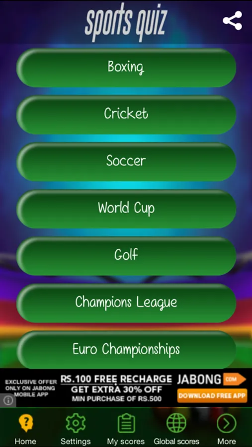 Sports quiz comprises more than ten categories including major and minor sports divisions like Soccer, Cricket, Formula-1, Winter sports, Golf etc. Each category has around 200-500 questions. Play and fail and repeat until you become a champion!