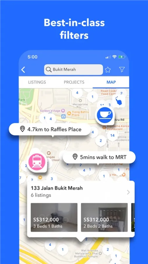 - Comprehensive information about each property such as commuting time to the office, distance to MRT/bus stations, schools, supermarkets and other amenities