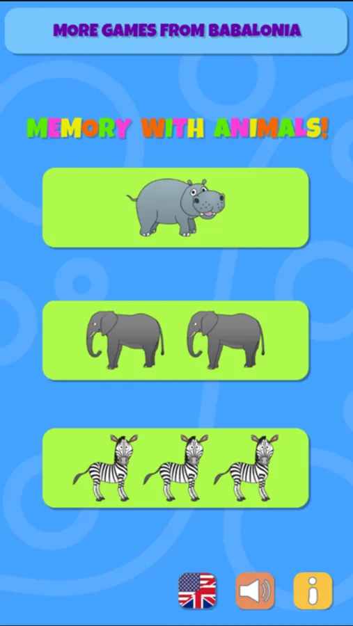 Additional benefits: The menu is simple so that the children can play without any parental help. The game does not contain text, so it is suitable for children of any age and linguistic ability. Finally, as the sounds alone are enough for the identification of the matching pairs, the game is suitable for users with sight impairment.