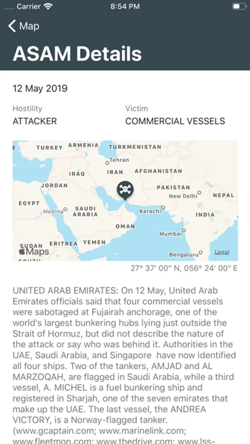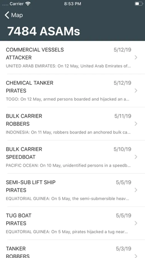 Anti-shipping Activity Messages (ASAM) include the geographic location and the reported descriptive accounts of specific hostile acts against ships, crews and passengers which include incidents of piracy, robbery, hi-jacking and kidnapping. Such reports may be useful for mariners traveling to or through active areas for recognition, prevention and avoidance of potential hostile activity. The ASAM Mobile app allows users to download all ASAMs to their mobile device and search, view, and query them independent of a data connection to increase maritime safety awareness. This app was developed by NGA in collaboration with Booz Allen Hamilton and contributors at GitHub (https://github.com/ngageoint/anti-piracy-iOS-app).