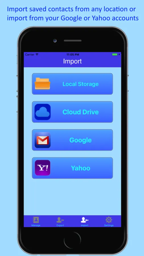 - Import Contacts directly from Google or Yahoo account (import from Hotmail not supported due to Microsoft's security restriction)