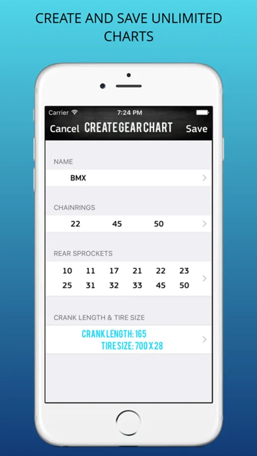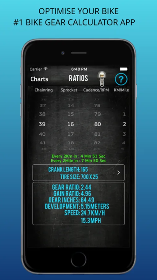 Optimize your bike to suit your style. Calculate Gear Inches, Gear Ratio, Development , Cadence in single screen. Let, know how many minutes you need to travel certain KM/Mile. Compare different settings and you can save as many as you want.