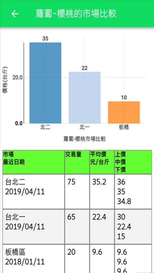 含有比較功能有:產地價格資訊、各地市場行情、30日行情走勢、各月銷售量、顯示每日歷史行情