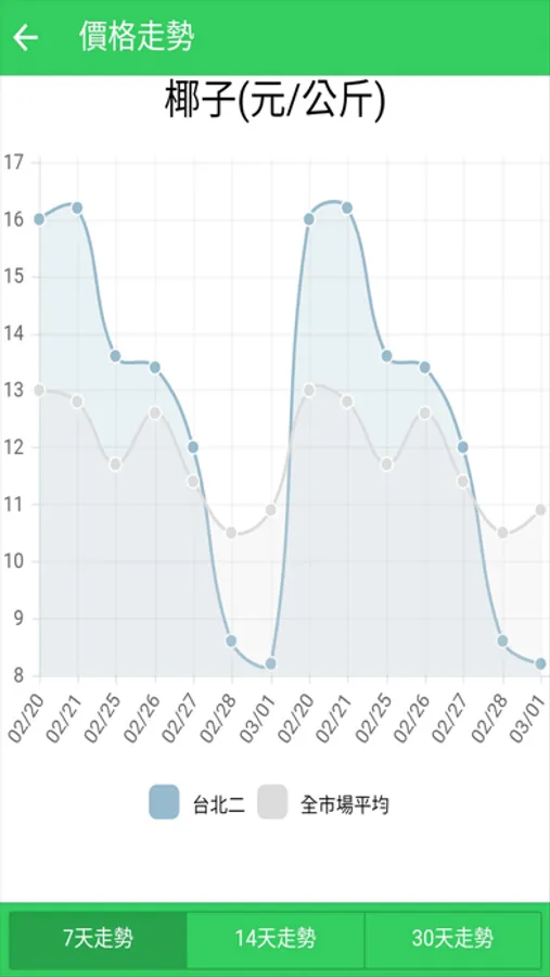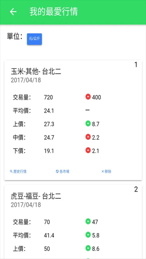 行情的查詢設計上,以階層式查詢方式進行市場、分類、作物分類、子分類等查詢,並提供加入我的最愛記錄,讓您喜愛的行情不會漏掉。