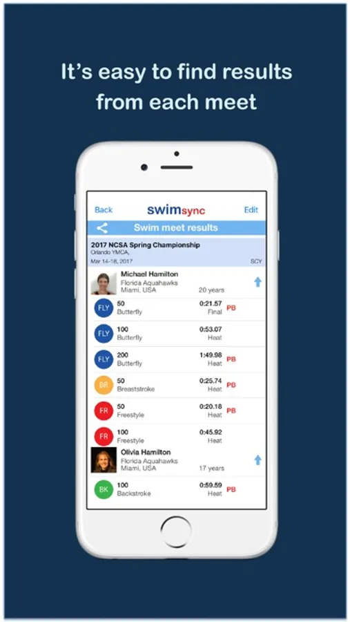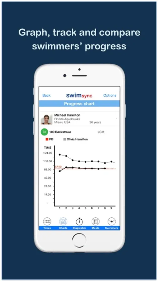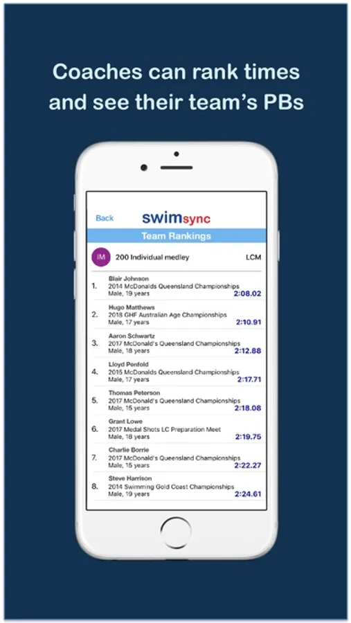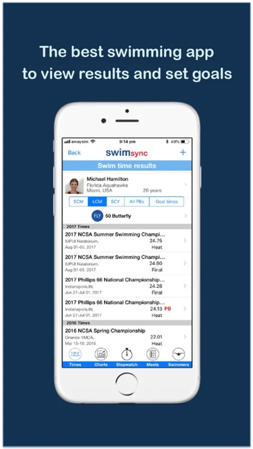 Swimsync is an excellent swimming app to organise and track your swim times. The app is designed for swimmers of all ages and abilities. Swimsync makes it easy to get up-to-date and organise your swimming life! You can save results for multiple swimmers, group their times into meets, strokes and distances, graph their times and view all swimmer's best times in one screen. In this new build, swimsync will also save results for yards and meters distances. In addition, with the new Team Times function, coaches can rank their swimmers' swim times and view their teams' personal best times.