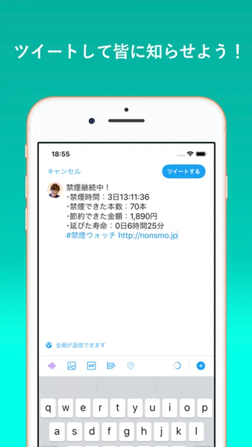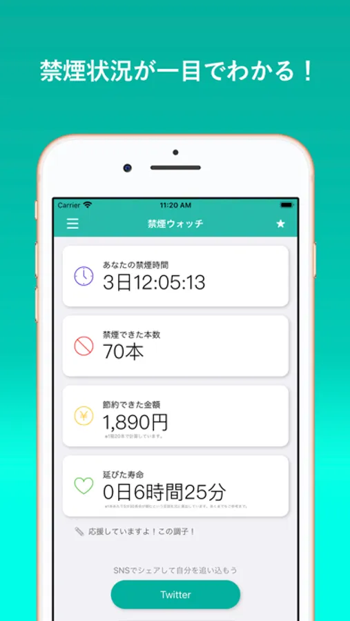 自分の禁煙時間や、節約できた本数などが一目でわかります。