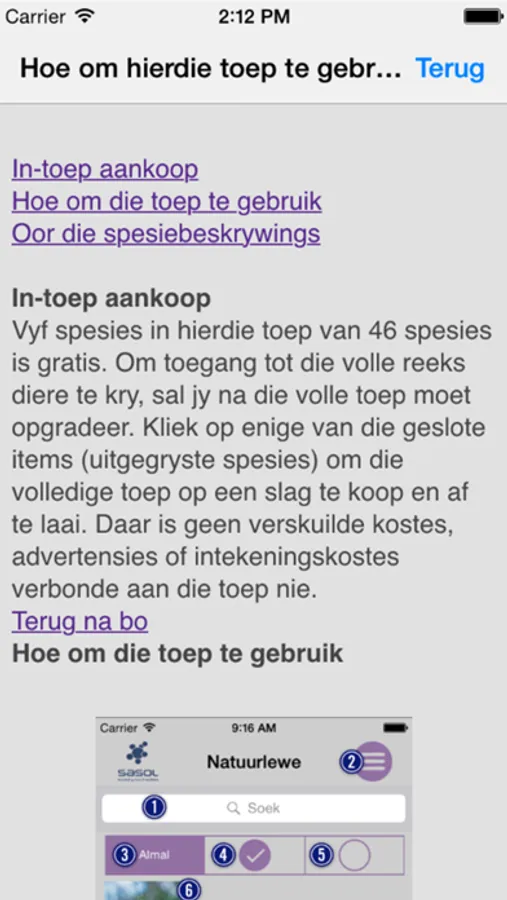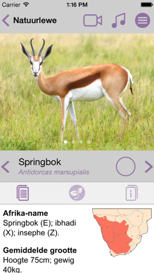 Hierdie toep is hoogs geskik vir beginners sowel as besoekers aan die streek. Dit sluit in pragtige foto's, video's diereroepe, kaarte en maklik leesbare teks oor Suider-Afrika se natuurlewe (insluitend die bewaringstatus van elke spesie).