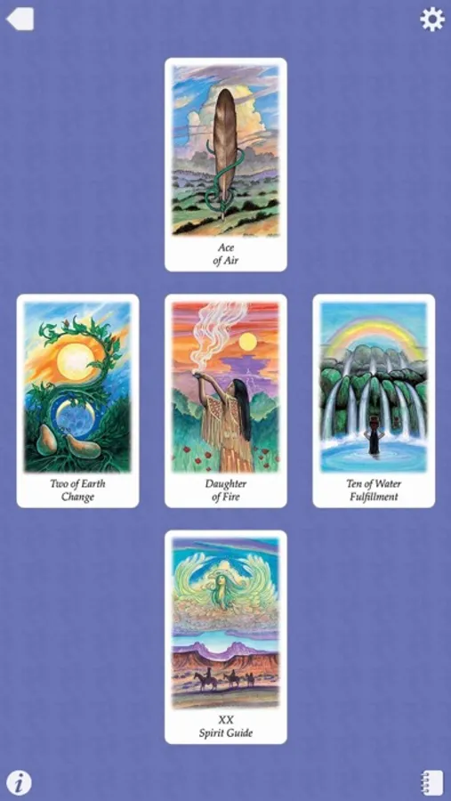 The deck is structured more like Thoth than RWS. Diverse scenes of tribal life comprise the Majors and the royalty. Card titles of the Majors have been recognizably renamed. The four suits are Fire, Water, Earth and Air. The pips show symbolic objects of the four elements, and most have a keyword.
