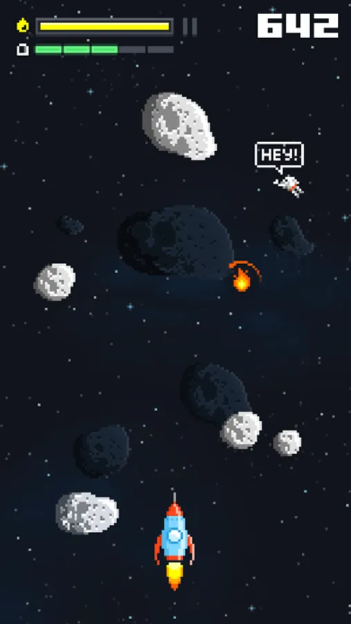 Get ready for an endless ride through space! An exciting retro arcade game experience! Ride your ship through space and rescue stranded astronauts, take power ups and destroy asteroids. Complete the journey to unlock items on the map. Reach higher scores and let your inner geek shine!