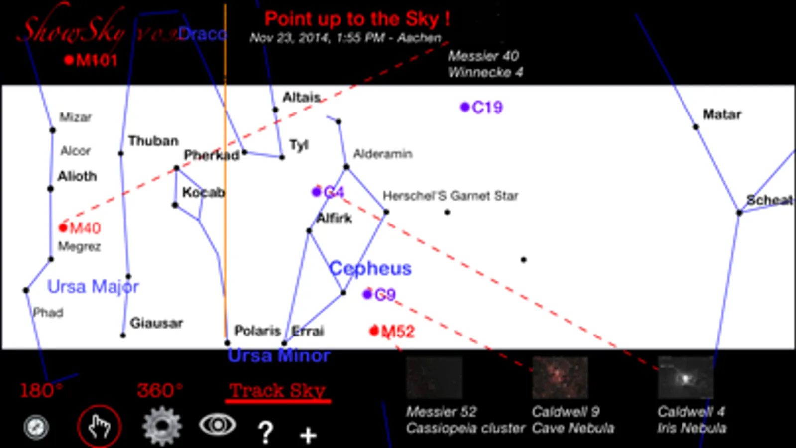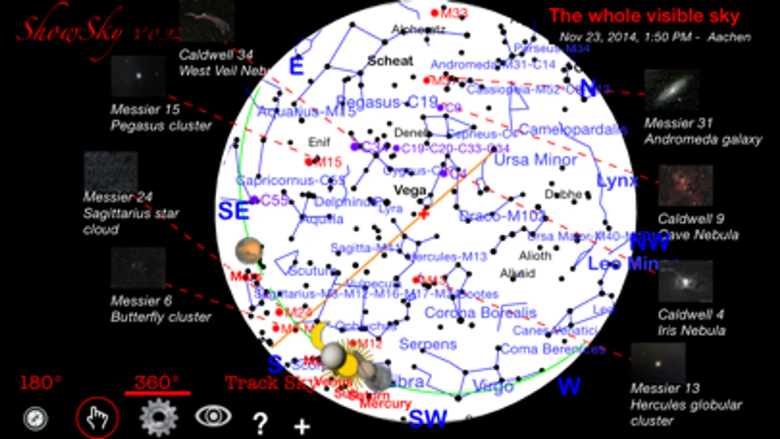 The 180 deg map shows you the whole sky in front of you with a flat horizon just as you see it. The 360 deg map shows you the whole visible sky at this moment and the "track" view allows you to point your device towards the sky and see in details what is there. Just turn around to see all currently visible constellation and objects.