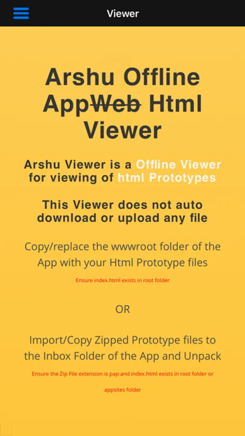 Arshu Offline AppWeb Viewer is Html AppViewer for viewing of Html content(app) (multiple html files) Prototypes without internet using iTunes Document Sharing Feature or extracting the Html App Prototypes directly from Files App.
