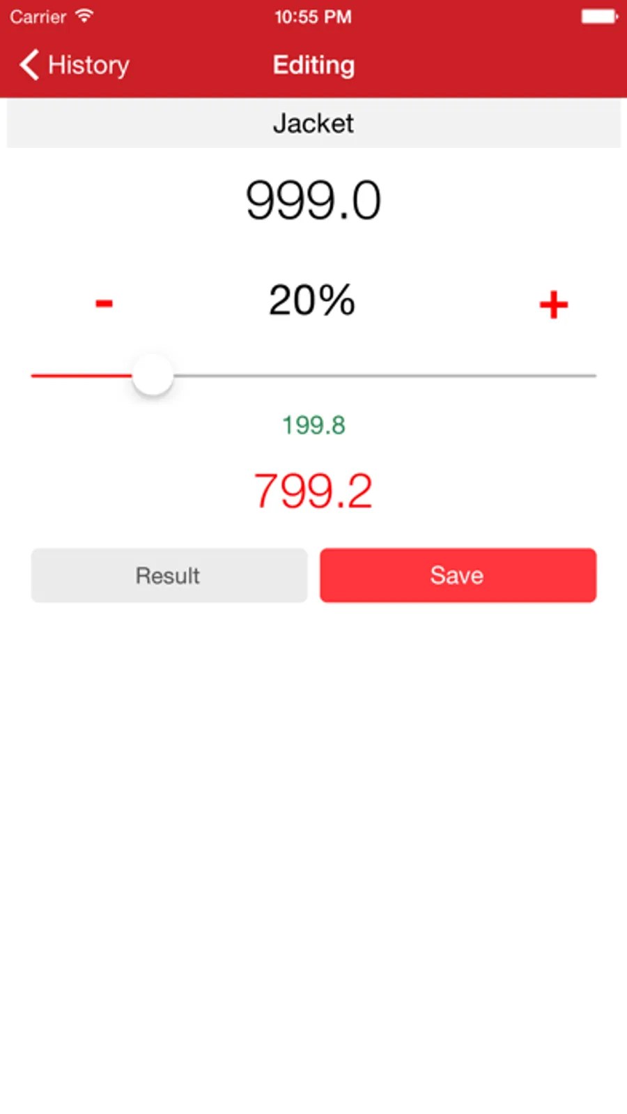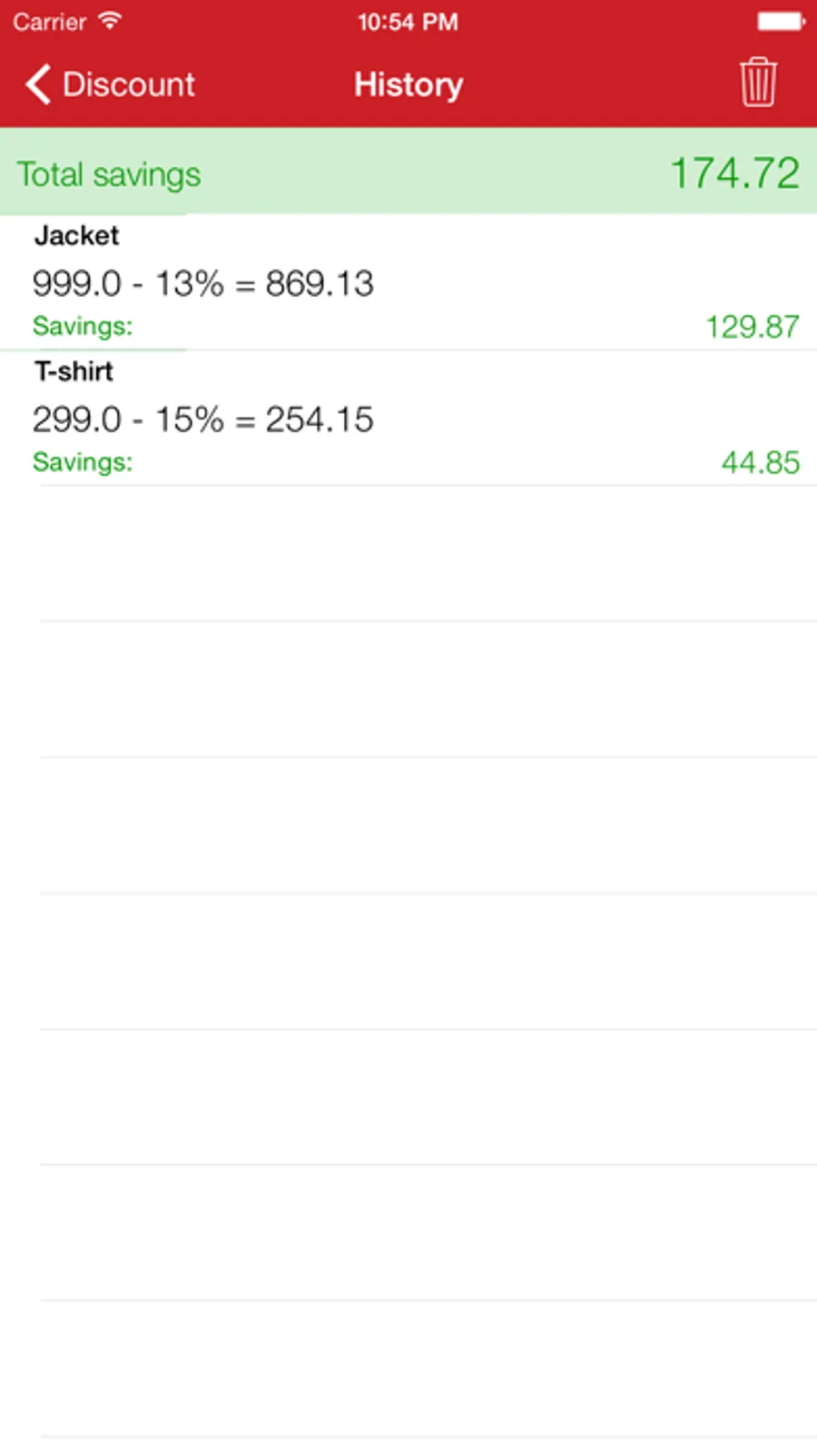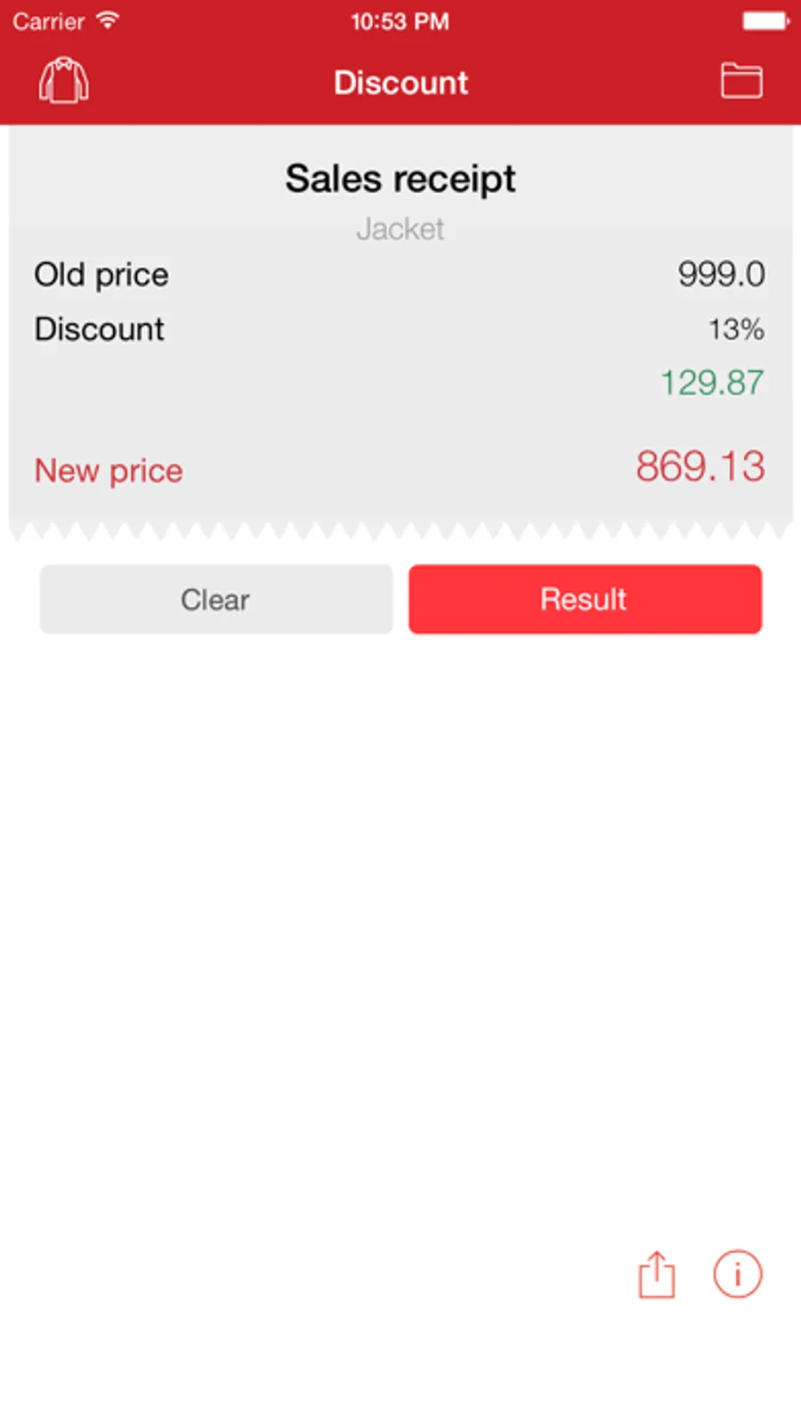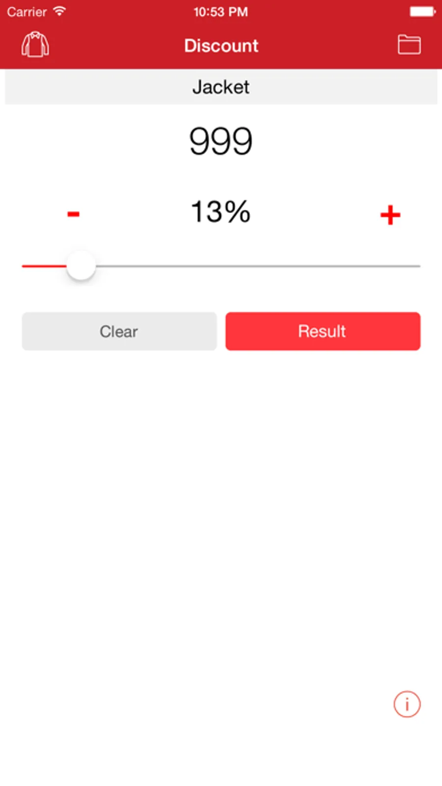 Discount - this is the app for fast calculation of discounts. You just need to enter the old price and choose the discount rate to calculate the new reduced price. For convenience was made to archive the previously calculated discount. In the Appendix there is a comparative table of clothing sizes.