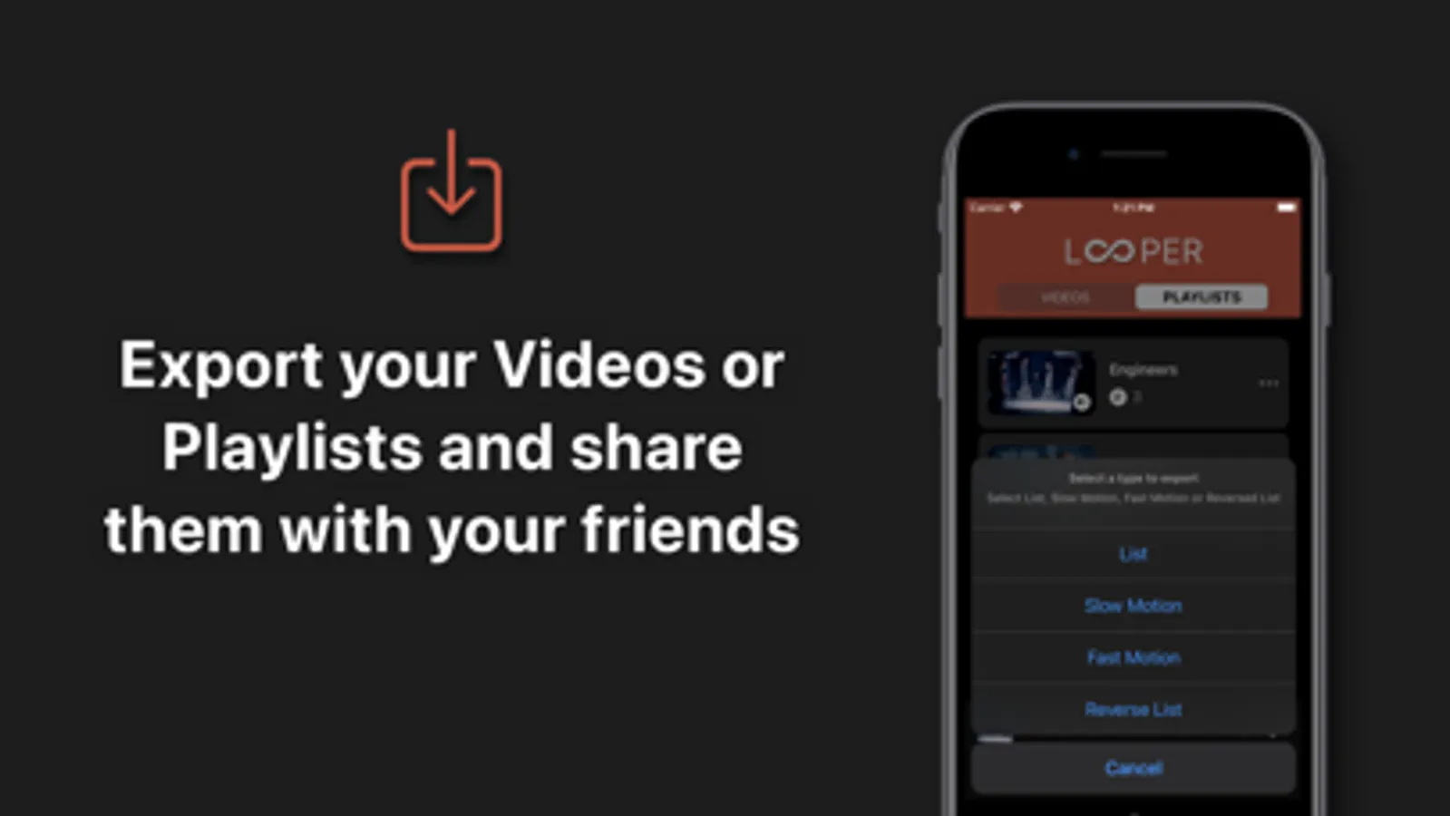 Looper is the only App that lets you repeat videos on your iOS devices or on an external screen infinitely and export a playlist of your favorite videos with a number of repetitions.