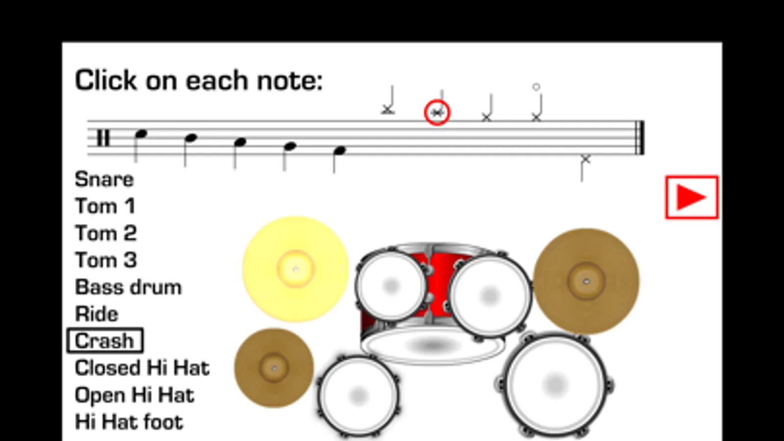 When the exercise begins you have to click on each part of the Drum Set that corresponds to that which is written. This has to be done at first sight in real time.