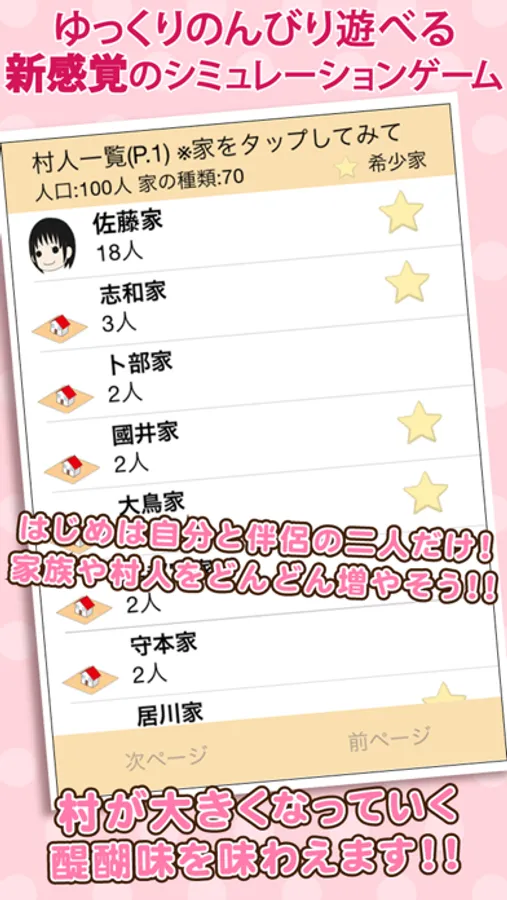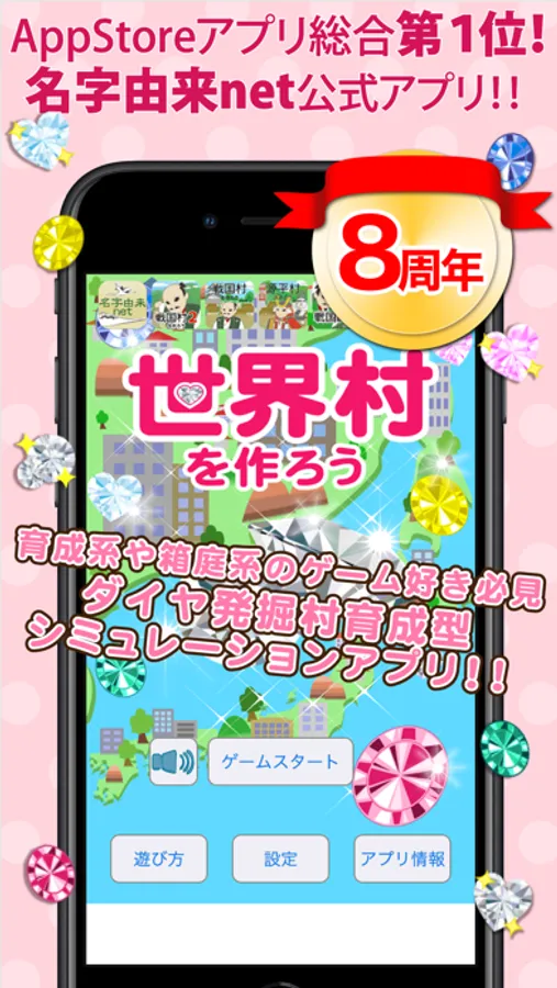 名字(苗字)に興味のある方もない方も、自分の名字を冠した村を成長させ、世界一の村を作っていくゲームです。ランキングでは日本中で最も強い村と村の発展を競うことができます。家族が少人数化していく現代だからこそ、ダイヤを集め自分の家族を増やし、村が大きくなる醍醐味を体験しましょう。