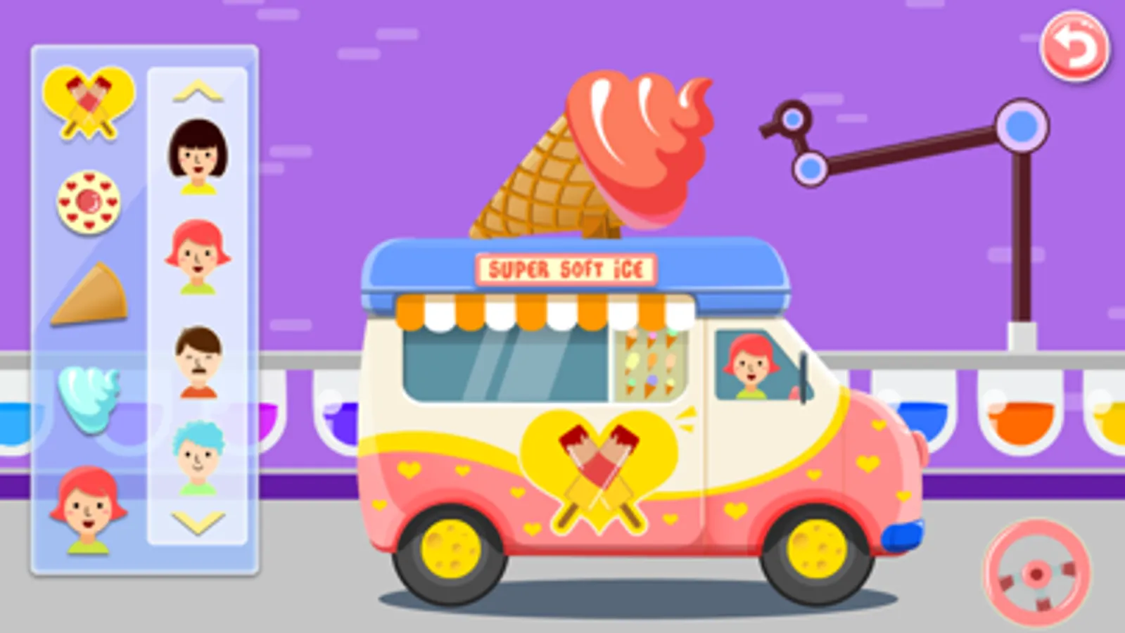 - Choose a screen to play: Make your truck, purchase delicious fruits and candies, drive your truck, selling ice cream.