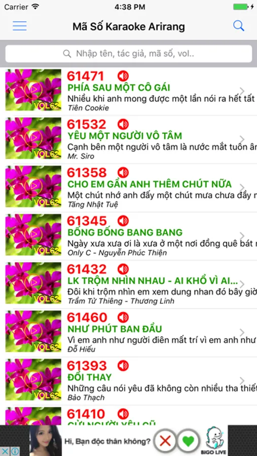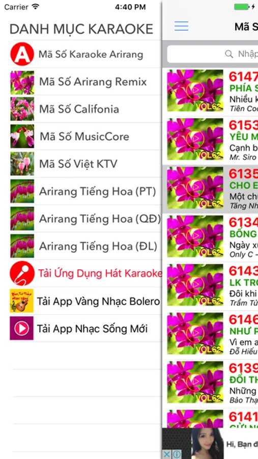 Ứng dụng Tra mã số Karaoke cập nhật tới VOL mới nhất bao gồm mã số karaoke Arirang, Califonia, Việt KTV, Music Core.