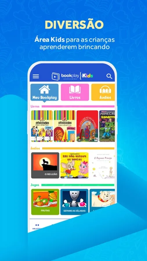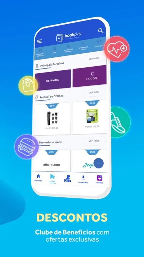 Além de todo esse conteúdo, o Bookplay possui uma versão exclusiva e didática para a criançada com milhares de livros, atividades para imprimir, áudios e jogos. Oferece também um Clube de Benefícios com ofertas e descontos especiais em alimentação, lazer, bem-estar, saúde, produtos e serviços.