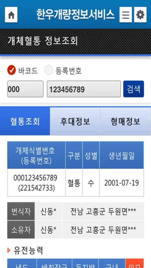 1) 개체혈통정보조회 : 바코드 000 123456789 [검색]