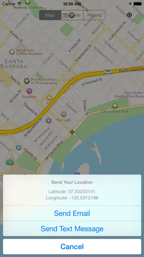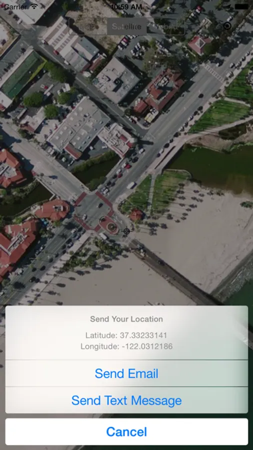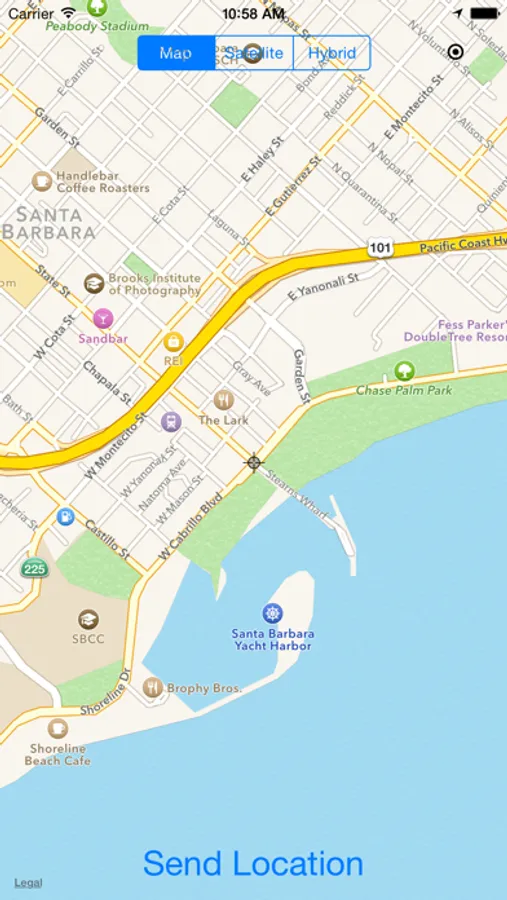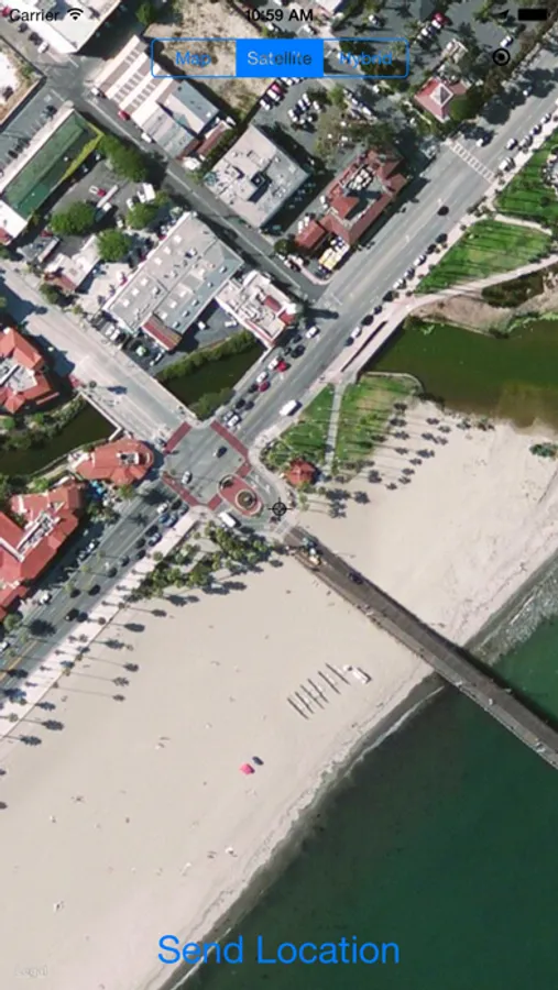 Right Here captures your GPS location and allows you to send via email or text message. Allows you to move the map so that you can send any location. For example, the map might show you at the foot of the local beach pier; you can then move the map so the crosshairs are centered at the end of the pier, so you could send that location to a friend: "Meet me at the end of the pier in 5 minutes."