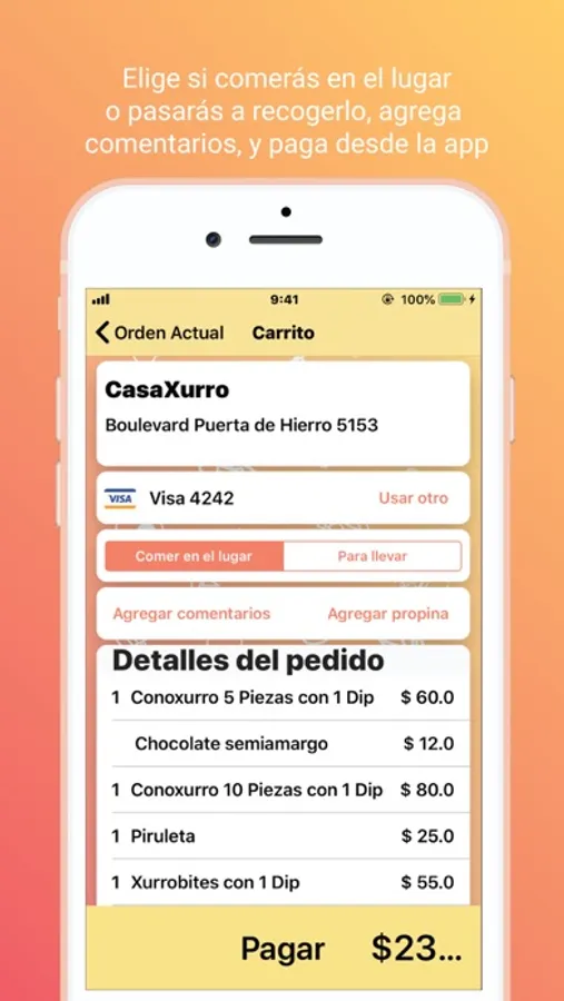 ¿Preparación al gusto? Personaliza tu platillo con modificadores, elige recoger tu pedido o comer, agrega comentarios como hora estimada de llegada, cuántas personas u otros detalles de la comida, paga y ¡listo!