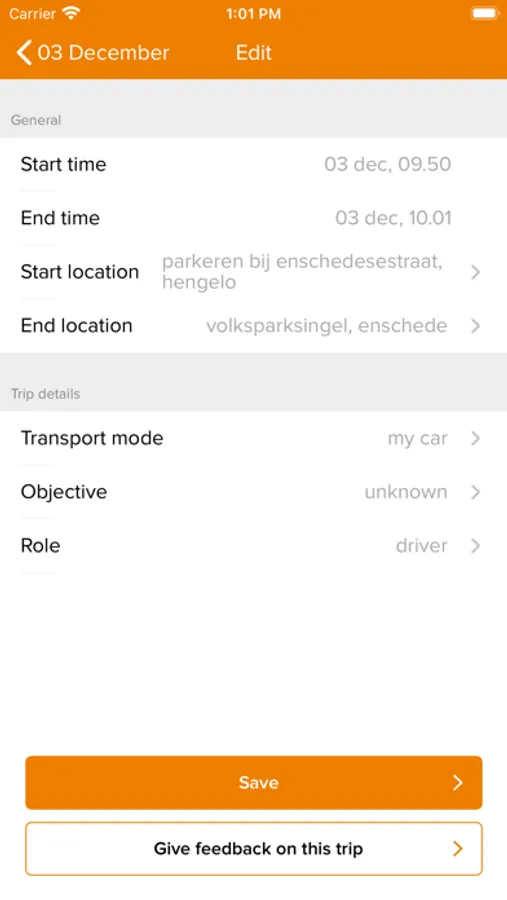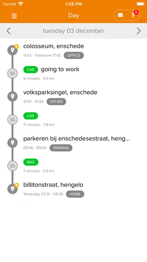 You will see the trips that you make start to appear in the day overview. The app tries to determine exactly when you have traveled, from where to where, via which route, and with which mode of transport.