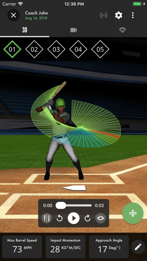 Watch the bat’s path using the unique 3D Viewer that shows bat and hand speed throughout the swing, impact and bat distance in the hitting zone. Using Video & Data Sync, pinpoint what every part of the body is doing during each step of the swing