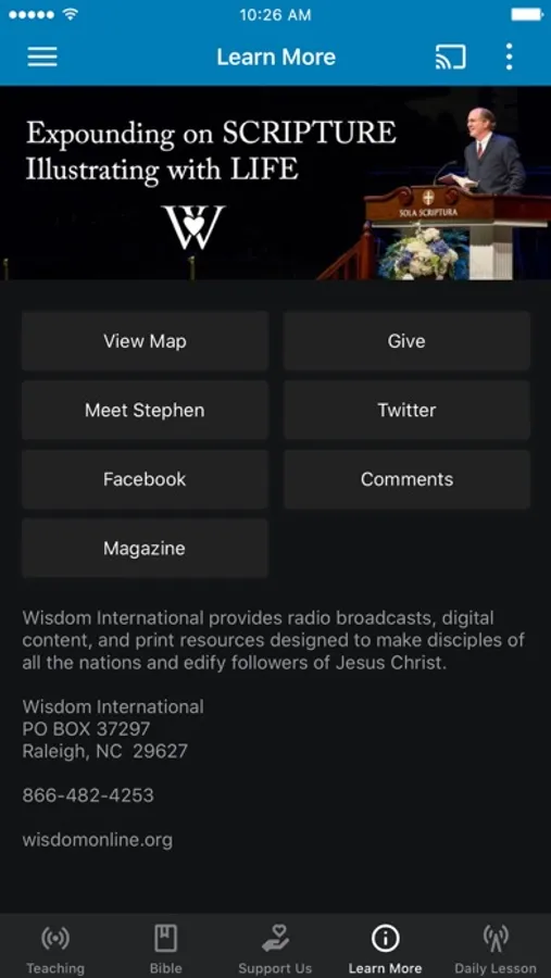 The Wisdom International app was developed with the Subsplash App Platform.