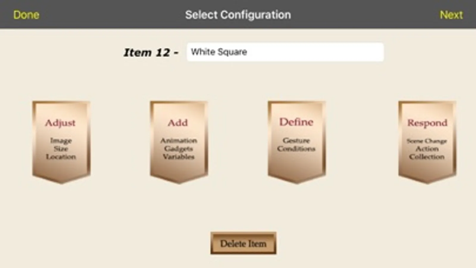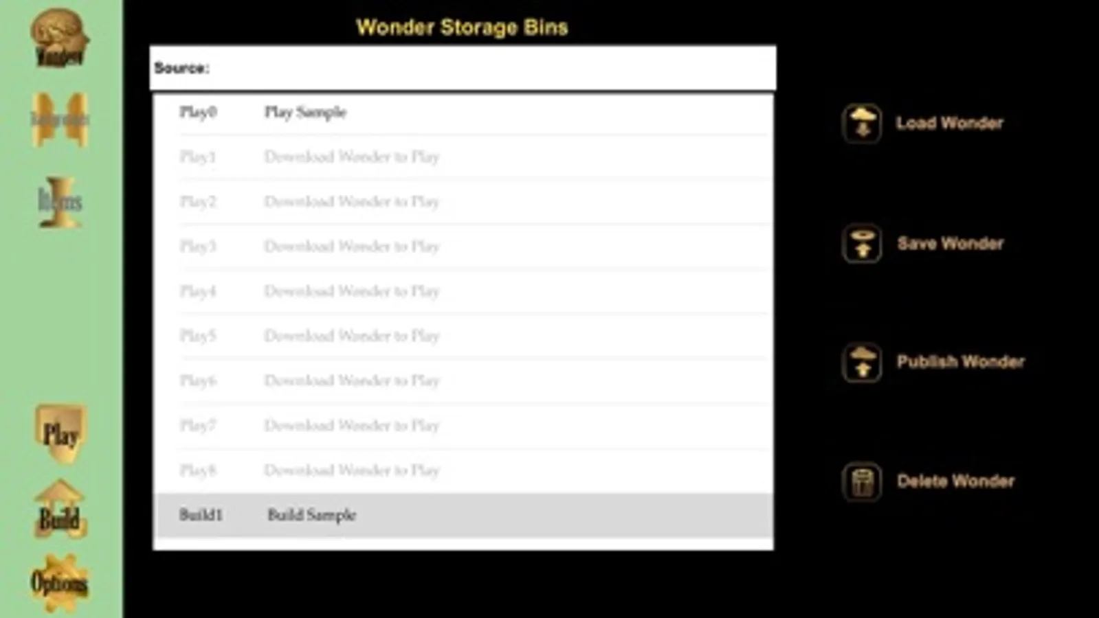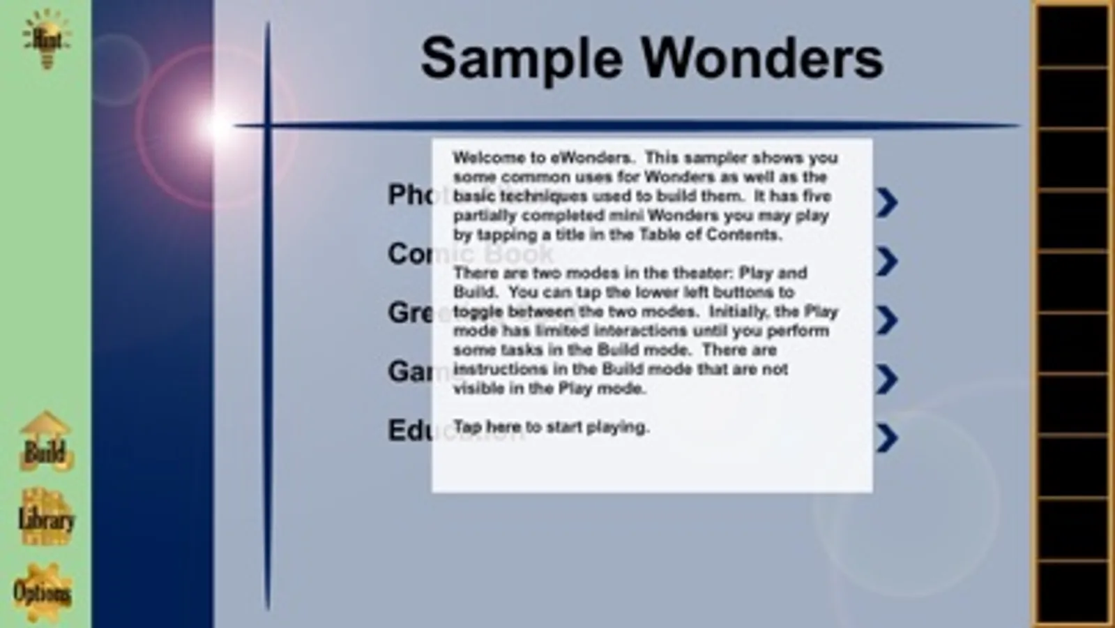 Building a Wonder is an easy and fun process using the eWonders app. A Wonders is composed of many scenes, and each scene is made up of a background image and several item objects. This can be done easily in the build environment by tabbing a background image and dragging items from the resource list. After all the item objects are properly placed on the main stage, their user interactions can be configured by tabbing on the items and selecting the properties presented by the navigation view windows. Upon completion of configuring the scene and all of its items, the user can save the scene and starting a new one. As the user repeat this process scene by scene and linking them into a story, a Wonder is created. eWonders is bundled with two wonders, Play Sample and Build Sample, and they provide a great introduction to usage of eWonders.