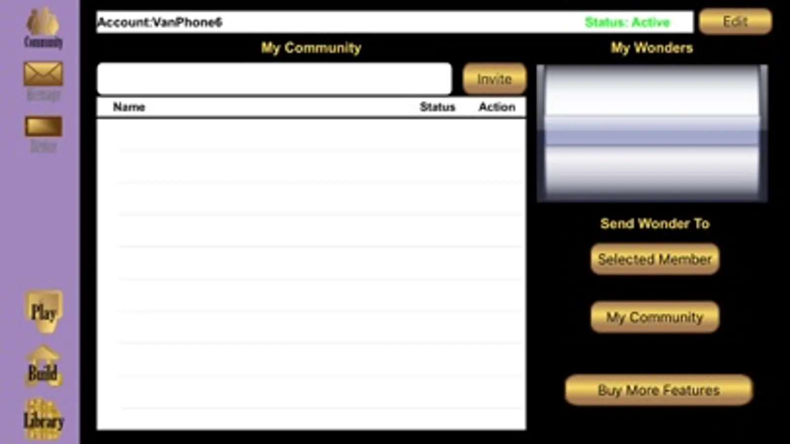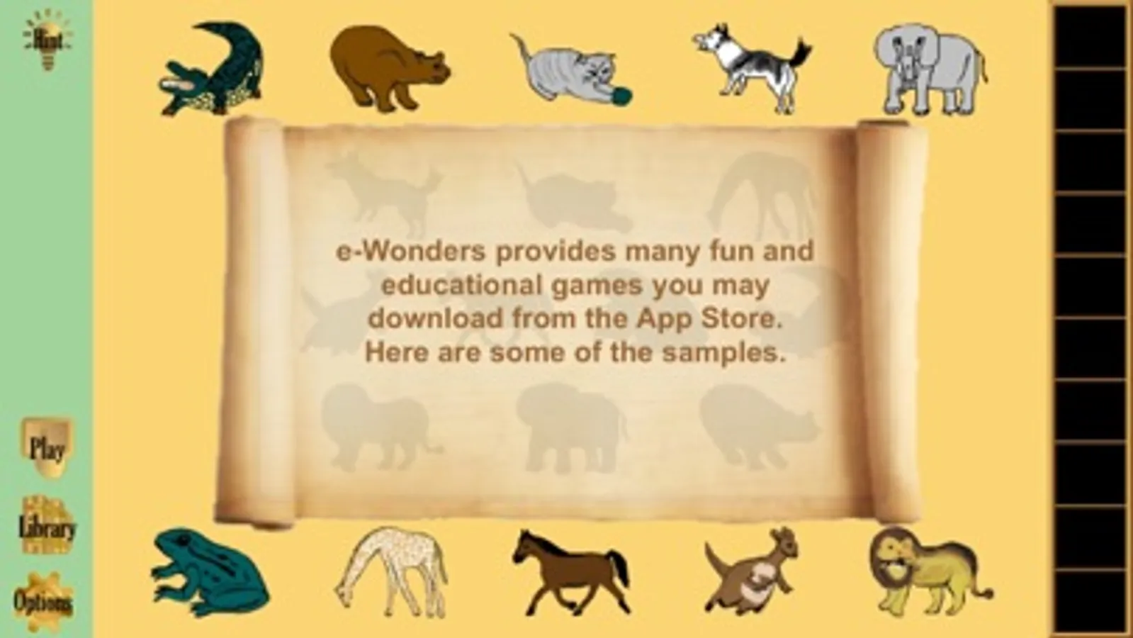 After eWonders app is launched, it will display four buttons allowing the user to select four different segments of the apps. These four segments are Play, Build, Library, and Option. The Play segment is for user to play a selected Wonder. The build segment provides the environment to create a new Wonder. The library segment is used to manage image resources and Wonders for playing and building Wonders. Lastly, the option segment is for interacting with device and online community. A user can switch among segments anytime while using the eWonders app. While in the process of creating a Wonder, the user can press the Play button to play a saved scene, the Library button to get more resources, or the Options button to send a message.