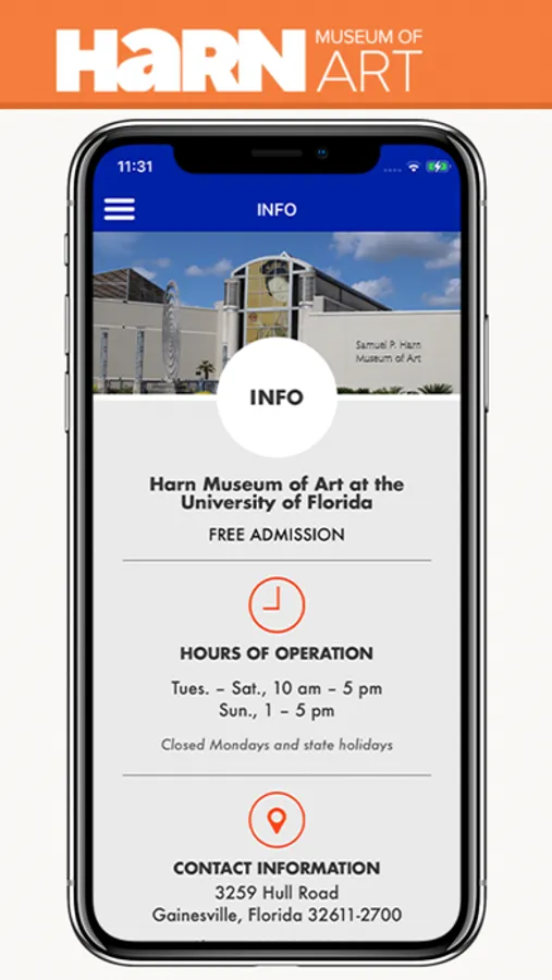 1. Information Page – The Information Page is specific to the Harn Museum of Art and lists the Harn’s address, phone number, and hours. The bottom of the Information Page includes the Harn’s donation button and links to Harn social media.