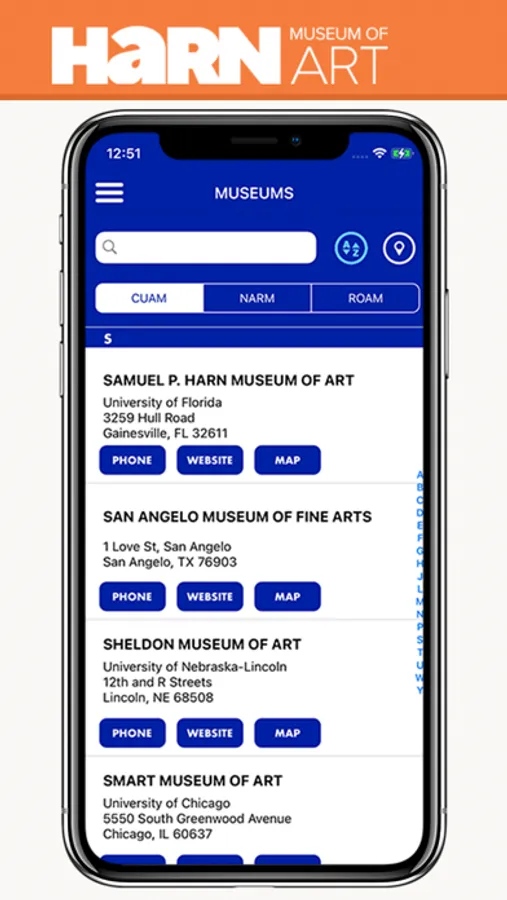 3. Museums List – The Museum List includes all the museums that belong to the NARM, ROAM, and CUAM networks. The list is searchable by name, city, state, and zip code. The museums’ addresses are listed along with their main phone numbers and websites. The map feature enables the user’s phone to locate a selected museum in relation to his/her GPS location.