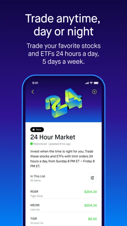 There are additional, unique risks with trading outside of regular market hours you should be aware of before making an investment decision, including the risk of lower liquidity, increased volatility, greater spreads, and pricing uncertainty. Robinhood 24 Hour Market is from Sunday 8 PM ET - Friday 8 PM ET.