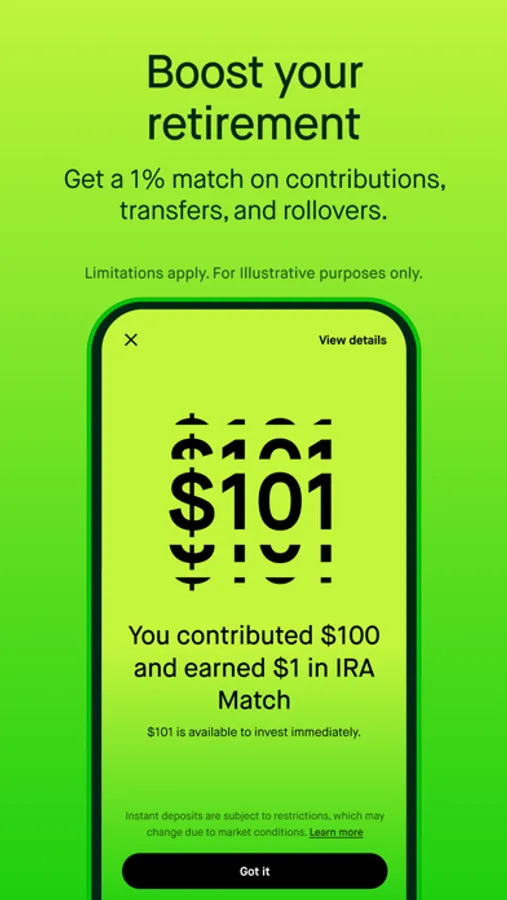 IRA match: Contributions must come from an external account and must be held in the Robinhood IRA for at least five years to avoid the possibility of a withdrawal fee
