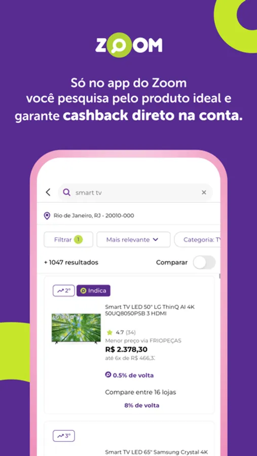 Não importa se você busca por eletrônicos, fogão, Smart TV ou por um celular novo, no app do Zoom você acha as ofertas e descontos das melhores lojas. Mais que um comparador de preços, o Zoom é um serviço que te ajuda a fazer a melhor compra!