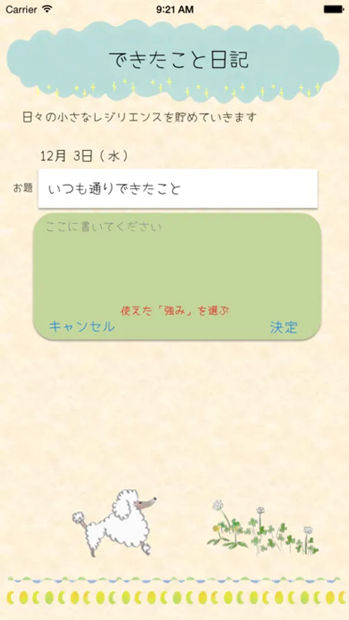 日々の小さな「できたこと」を貯めると、レジリエンスを育っていきます。「できたこと」といっても、大きなことではなく、むしろ小さなことの方に注目してください。ランダムでお題が出ますので、お題に合わせて、記録してみてください。お題を毎日定刻(iPhone本体「設定」から変更可能)に通知するリマインダー機能があります。