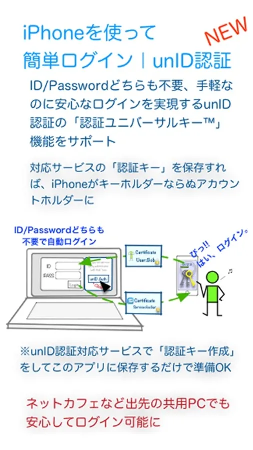 また、本アプリは「認証ユニバーサルキー」機能に対応していますので、unID認証をサポートするサービスの認証キーをこのアプリに保存することでID、Password不要のログイン認証を利用できます。